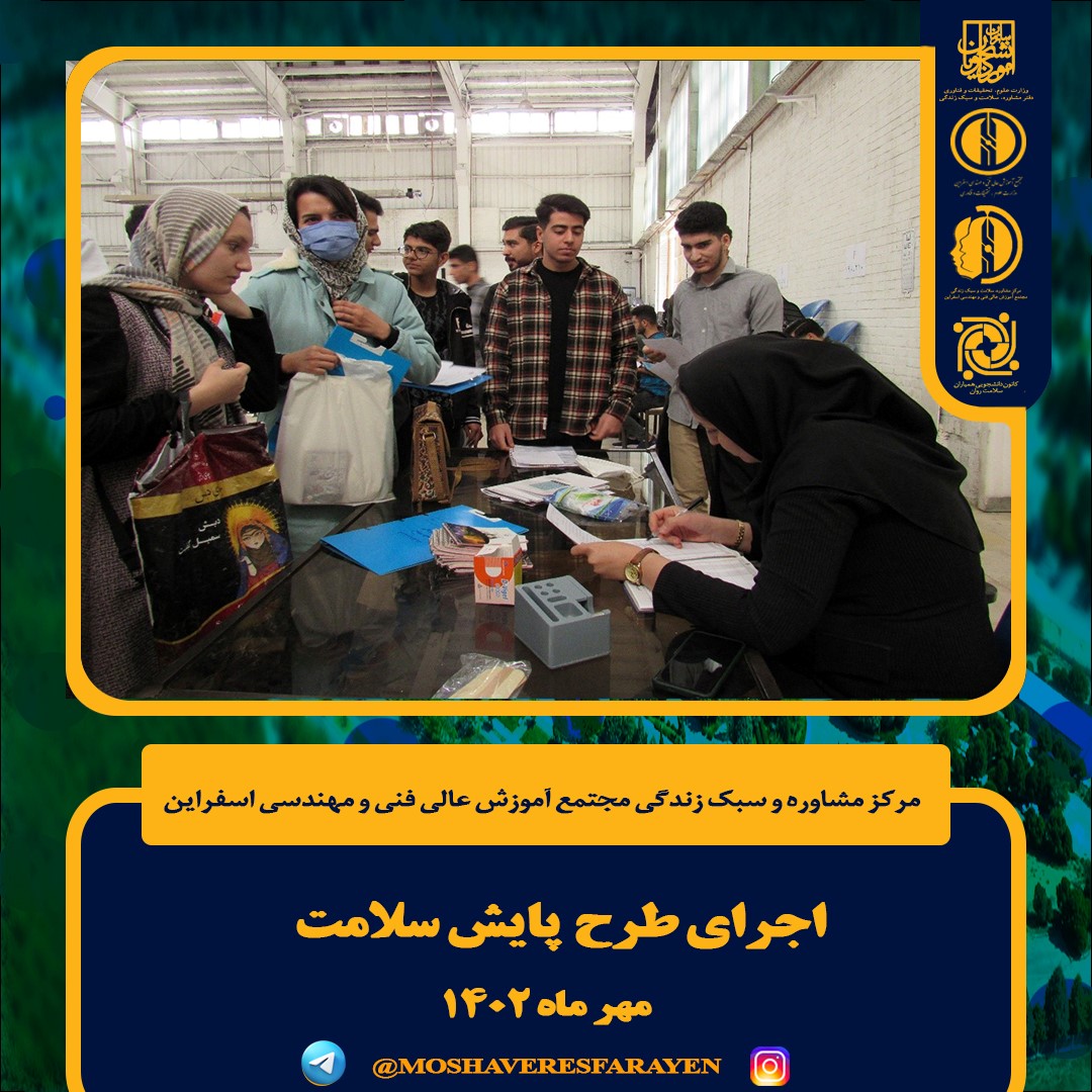 طرح پایش سلامت جسم و روان با همکاری همیاران سلامت در مرکز مشاوره و سلامت مجتمع آموزش عالی اسفراین با هدف بررسی کامل سلامت دانشجو، غربالگری، بیماریابی و کنترل سلامت قبل از بیماری و حمایت از دانشجویان در معرض خطر انجام می گیرد. دانشجویان فرایند تکمیل کارنامه سلامت روان را با ثبت نام در سامانه سجاد و تکمیل کارنامه سلامت جسم را با مراجعه به پرستار معتمد در مرکز مشاوره، خوابگاه دختران امید آینده و یا خوابگاه پسرانه ساریگل انجام دادند.